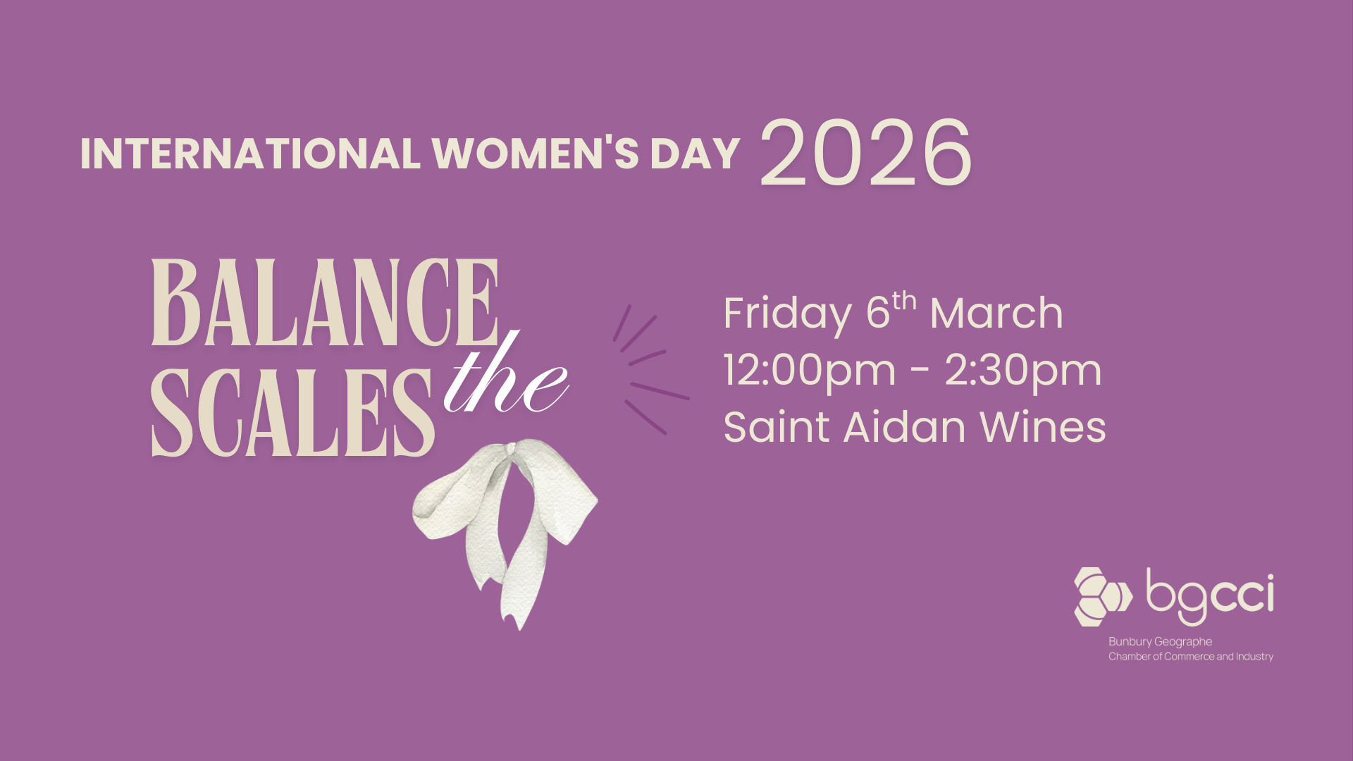 Join the Bunbury Geographe CCI for an International Women's Day Lunch hosted at Saint Aidan Wines in Ferguson Valley.
